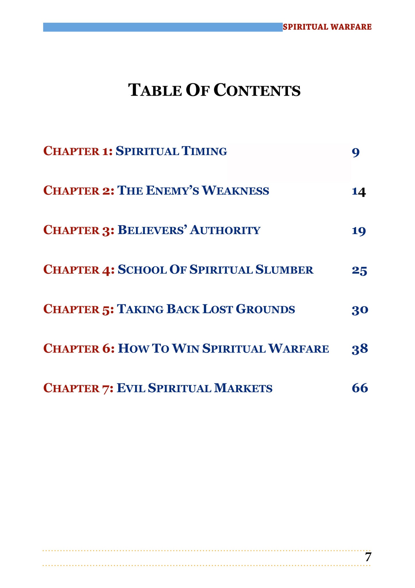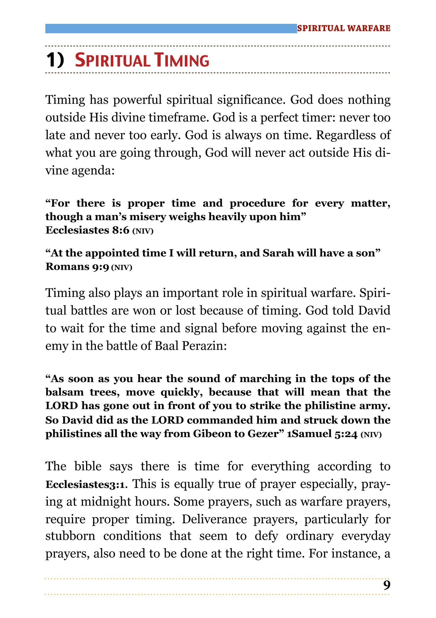 For instance, there are certain periods and time to attack and defeat certain wicked powers and problems. There are selected hours to do certain spiritual battles for good and quick results. This book exposes these strategies in very simple and easy to grasp format. It dives deep into spiritual events that occur at specific times; that if one is aware of, could be used to win quick victories. It talks about spiritual markets, when they hold, what they do and how to dislodge and defeat their purposes in your life. And much more.